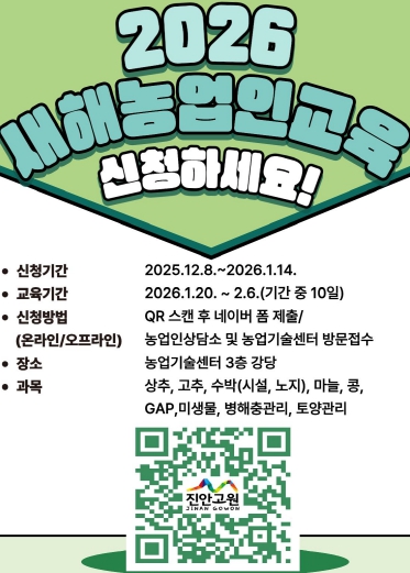 [뉴스앤톡] 진안군이 ‘2026년 새해농업인 실용교육’ 참여 교육생을 다음달 14일까지 모집한다.