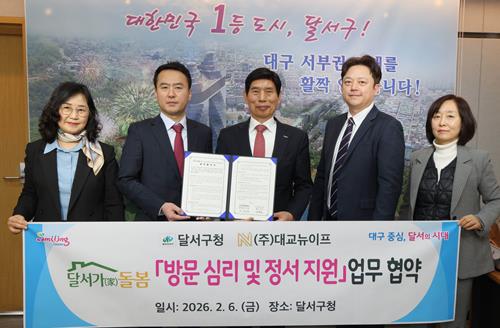 [뉴스앤톡] 대구 달서구는 지난 6일, 2026년 ‘지역사회 통합돌봄’ 본사업의 성공적인 시행을 위해 어르신 심리·정서(인지) 케어 전문기관인 대교뉴이프와 업무협약을 체결하고,‘달서형 지역특화 통합돌봄 사업’을 선제적으로 추진한다.