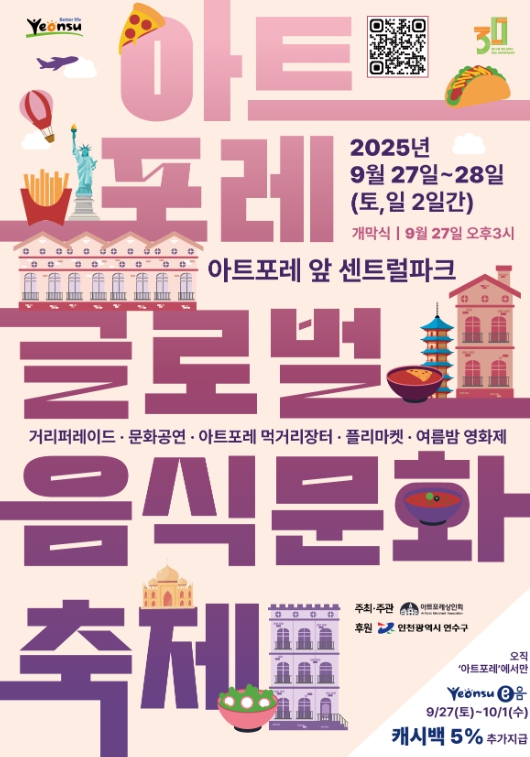 [뉴스앤톡] 연수구는 오는 27일과 28일 양일간 13시에서 18시까지 ‘아트포레 음식특화거리’와 센트럴파크 일원에서 지역 상권 활성화와 글로벌 음식문화 교류를 위한 ‘제1회 아트포레 글로벌 음식문화축제’를 개최한다.