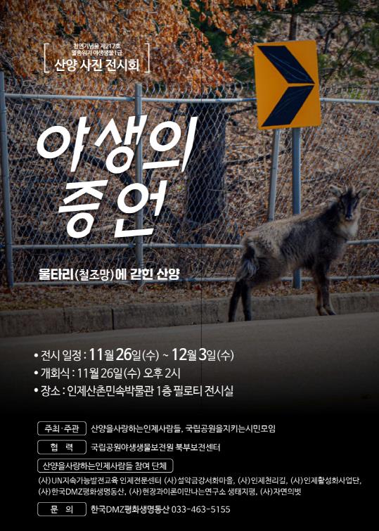 [뉴스앤톡] ‘산양을 사랑하는 인제 사람들’과 ‘국립공원을지키는시민의모임’은 오는 11월 26일부터 12월 3일까지 인제산촌민속박물관 1층 필로티 전시실에서 ‘야생의 증언 – 울타리(철조망)에 갇힌 산양(천연기념물 제217호, 멸종위기 야생생물 1급)’ 사진전을 개최한다.