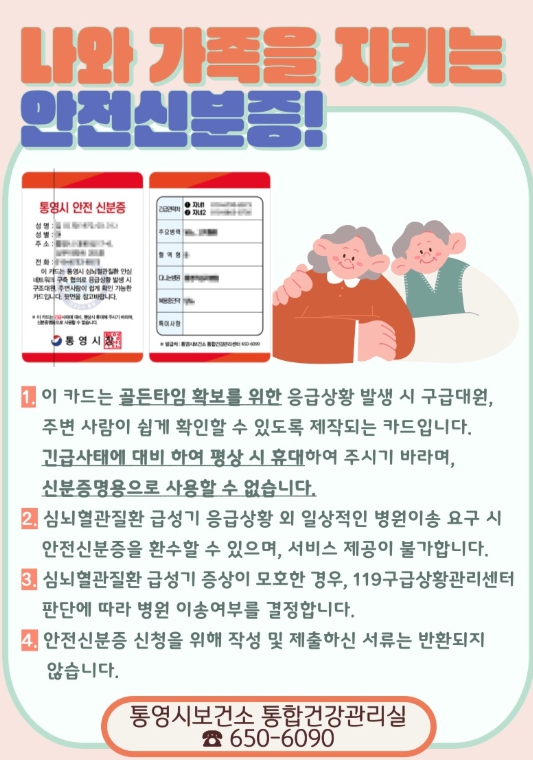 [뉴스앤톡] 통영시는 심뇌혈관질환자의 골든타임 확보를 위해 안전신분증 발급과 119 안심콜 등록 서비스를 제공한다고 19일 밝혔다.
