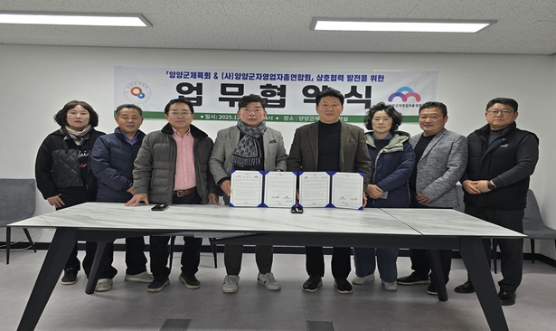 [뉴스앤톡] 양양군체육회와 (사)양양군자영업자총연합회는 지난 12월 3일에 지역 경제와 체육의 상호 시너지 효과를 높이기 위한 업무협약을 체결했다.