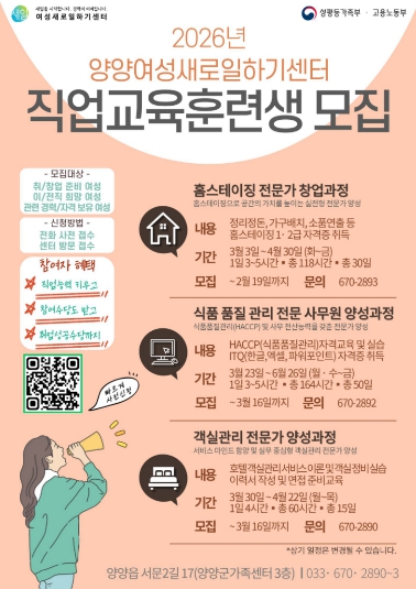 [뉴스앤톡] 양양여성새로일하기센터는 취·창업을 희망하는 여성을 대상으로 2026년도 직업교육훈련생 50명을 모집한다.