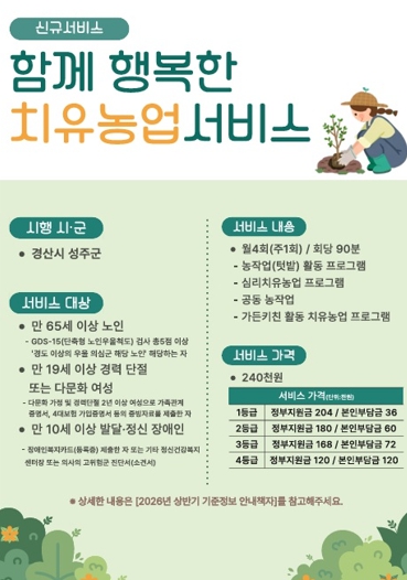[뉴스앤톡] 경상북도농업기술원은 2026년부터 치유농업을 활용한 *지역사회서비스를 본격적으로 추진, 공공형 치유농업을 확산해 지역 주민 삶의 질 향상과 지속 가능한 치유 서비스 제공 체계를 마련한다.