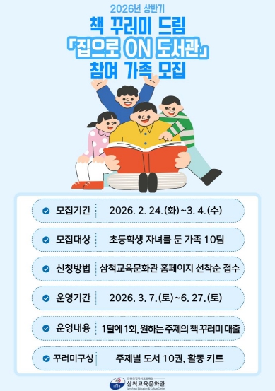 [뉴스앤톡] 삼척교육문화관은 3월부터 6월까지 가족 단위 독서 문화를 장려하기 위하여 초등학생 자녀를 둔 가족을 대상으로 책 꾸러미 드림 ‘집으로 온(ON) 도서관’을 운영한다.