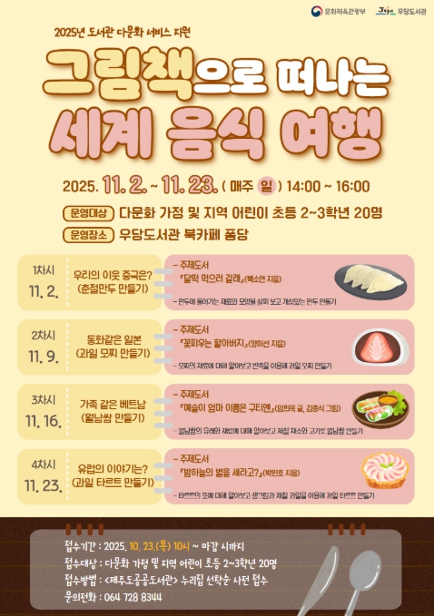 [뉴스앤톡] 제주시 우당도서관은 2025년 도서관 다문화 서비스 지원 사업인 ‘그림책으로 떠나는 세계 음식 여행’ 프로그램 참여자를 10월 23일부터 선착순 모집한다.