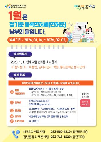 ▲ 인천 서구, 1월은 정기분 등록면허세(면허) 납부의 달 안내