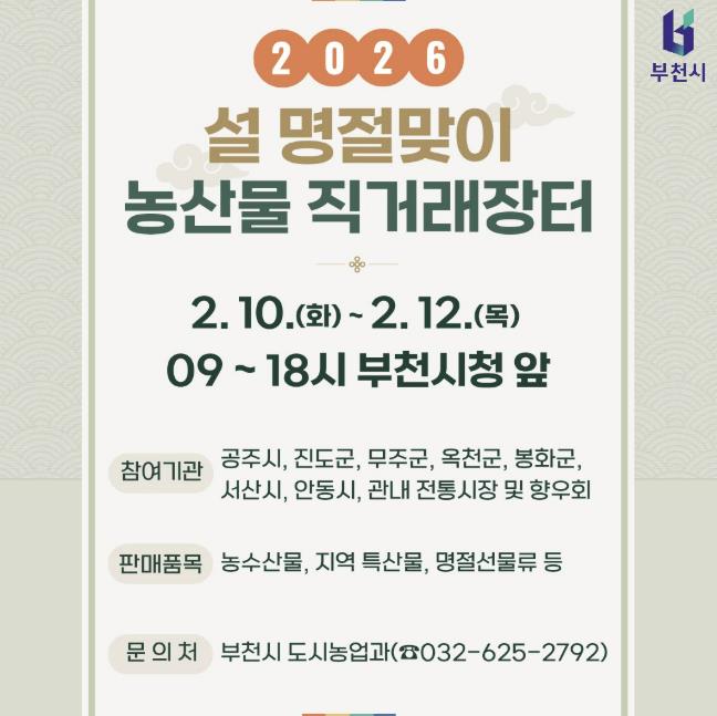 [뉴스앤톡] 부천시는 설 명절을 앞두고 2월 10일부터 12일까지 시청 정문 앞에서 ‘2026년 설 명절맞이 농산물 직거래장터’를 연다.