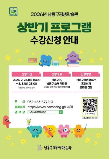 [뉴스앤톡] 인천시 남동구 평생학습관은 구민의 자기 계발과 지적 성장을 위해 오는 24일부터 ‘2026년 상반기 평생학습 프로그램’ 학습자를 모집한다고 20일 전했다.