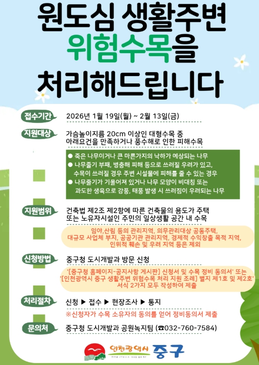 [뉴스앤톡] 인천시 중구는 원도심 권역을 대상으로 ‘2026년도 원도심 생활 주변 위험 수목 처리지원 사업’을 추진한다고 21일 밝혔다.