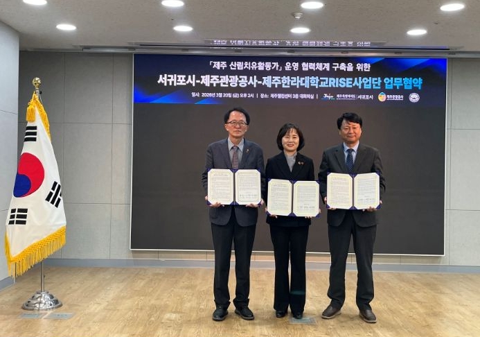 [뉴스앤톡] 서귀포시는 20일 제주관광공사, 제주한라대학교 RISE사업단과 함께 ‘제주 산림치유활동가 운영 협력체계 구축을 위한 업무협약’을 체결했다고 밝혔다.