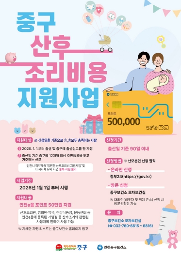 [뉴스앤톡] 인천시 중구는 출산 가정의 경제적 부담을 덜어주기 위해 새해인 오는 2026년 1월 1일부터 ‘중구 산후조리비 지원 사업’을 본격적으로 시작한다고 밝혔다.