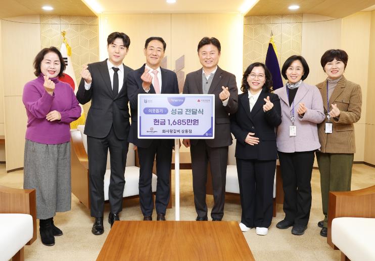 [뉴스앤톡] 부천시는 지난 20일 화사랑갈비 상동점이 개점 1주년을 맞아 하루 매출 1,685만 원 전액을 부천시 이웃돕기 성금으로 기탁했다고 21일 밝혔다. 이날 전달식에는 화사랑갈비 상동점 이강영 대표이사 등 임직원 3명이 참석해 차담과 함께 성금 전달과 기념 촬영을 진행했다.