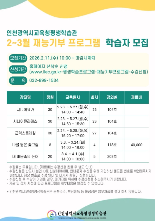 수강 신청은 11일 오전 10시부터 평생학습관 누리집에서 선착순으로 진행되며, 자세한 사항은 누리집의 공지사항을 확인하거나 평생교육부로 문의하면 된다.