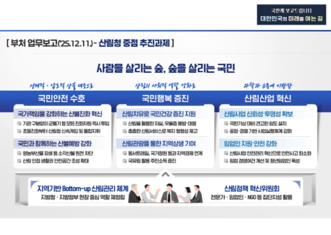 [뉴스앤톡] 산림청은 ‘정부 업무보고’를 계기로 ‘사람을 살리는 숲, 숲을 살리는 국민’ 실현을 위한 중점 추진과제를 11일 발표했다.