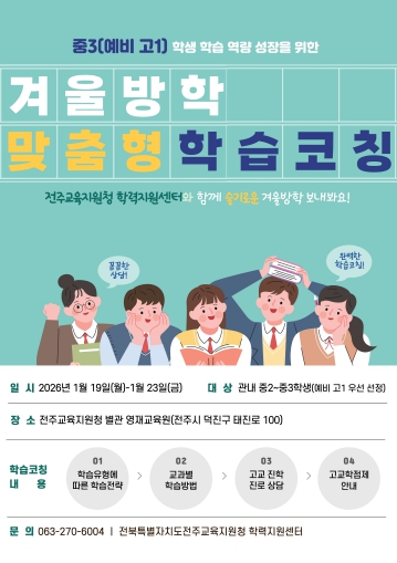 [뉴스앤톡] 전북특별자치도전주교육지원청은 학교급 전환기를 맞은 중학교 3학년 학생들의 학습 공백을 최소화하고, 성공적인 고등학교 안착을 돕기 위해 ‘겨울방학 맞춤형 학습코칭’을 운영한다고 15일 밝혔다.