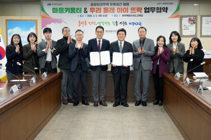 [뉴스앤톡] 제주특별자치도교육청은 제주특별자치도개발공사와 5일 도교육청 상황실에서 공공임대주택 유휴공간을 활용한 ‘우리 올레 아이 뜨락’ 사업과 도교육청 ‘2026 마을키움터 운영’ 사업의 상호 협력을 위한 업무협약을 체결했다.