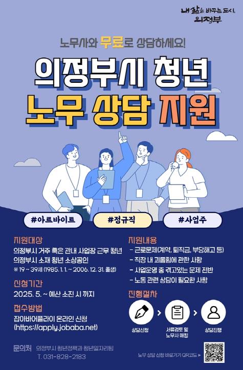 상담 대상은 19~39세 청년 중 의정부시에 거주하거나 관내 사업장에서 근무하는 청년, 의정부 소재 청년 소상공인이며, 상담료는 무료다.