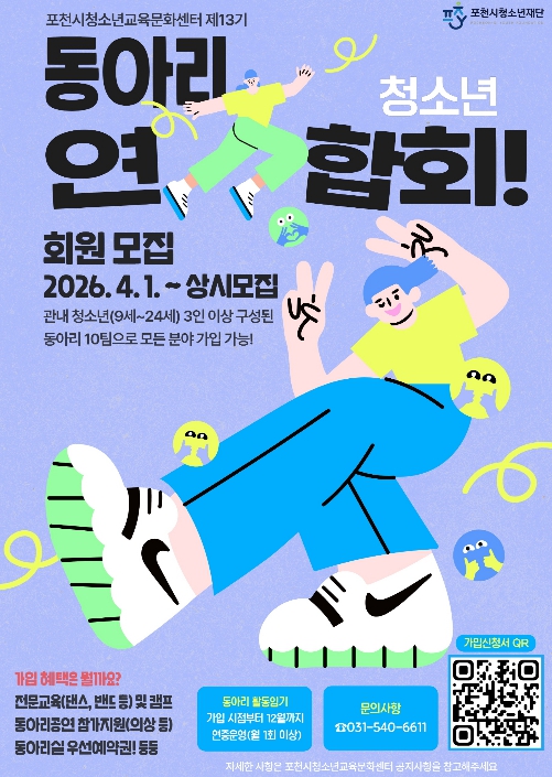 [뉴스앤톡] 포천시청소년재단 포천시청소년교육문화센터는 지역 청소년의 자율적이고 창의적인 활동을 지원하기 위해 ‘제13기 청소년동아리연합회’ 회원을 모집한다.