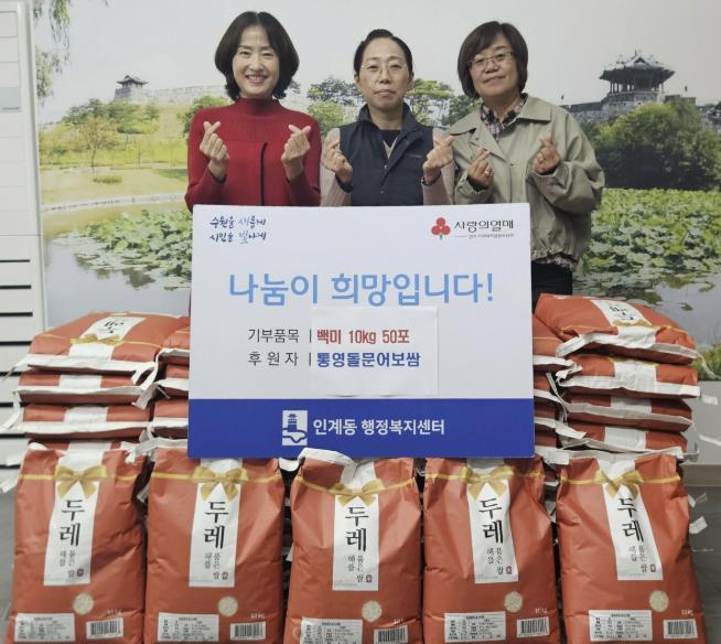 | ▲ 통영돌문어보쌈, 수원시 팔달구 인계동 행정복지센터에 백미 50포 전달하며 나눔활동 지속 |