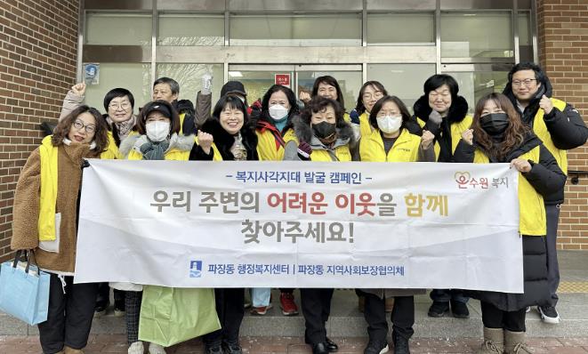 장인영 파장동장은 “이번 캠페인을 통해 지역 내 복지사각지대 대상자를 발굴하고 주민과 함께 복지 안전망를 강화하는 계기가 됐다”며“앞으로도 현장 중심의 복지사각지대 발굴 활동을 지속적으로 추진하겠다”고 말했다.