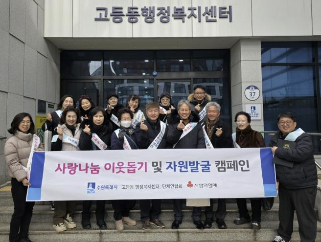 [뉴스앤톡] 수원시 팔달구 고등동 행정복지센터와 고등동 단체연합회는 지난 1월 26일, 지역 내 다양한 복지자원을 발굴해 이웃돕기로 연계하기 위한 사랑나눔 이웃돕기 및 자원발굴 캠페인을 실시했다.