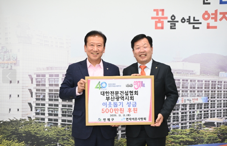 [뉴스앤톡] 연제구는 11월 11일 대한전문건설협회 부산광역시회(회장 김형겸)로부터 이웃돕기 성금 500만원을 기탁 받았다. 기탁 받은 성금은 취약계층 지원을 위한 사업에 이용될 예정이다.