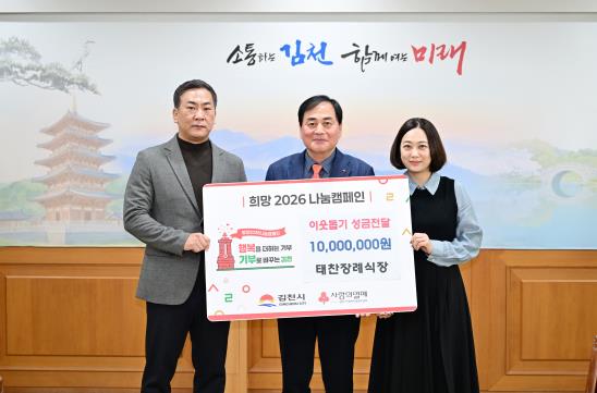 [뉴스앤톡] 김천시는 지난 1일, 태찬장례식장이 이웃돕기 성금 1,000만 원을 전달하며 희망2026나눔캠페인‘김천 1호’ 기부자가 됐다고 밝혔다.