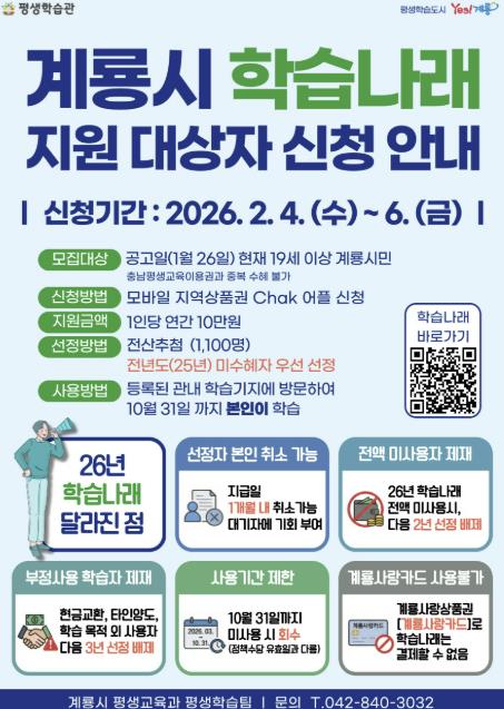 올해 학습나래 사업은 공고일(1월 26일) 현재 19세 이상 계룡시민을 대상으로, 1인당 연간 10만 원의 평생학습 지원금을 총 1,100명에게 지급해 시민들의 자기계발과 역량 강화를 지원할 예정이다.