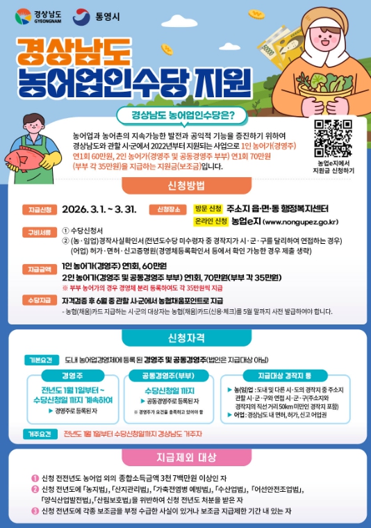 [뉴스앤톡] 통영시는 농어업의 공익적 기능 강화와 농어촌의 지속 가능한 발전을 위해 지급하는‘2026년 농어업인수당’을 다가오는 3월 1일부터 31일까지 한 달간 신청 받는다고 밝혔다.