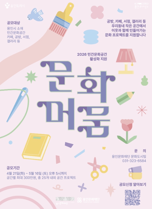 [뉴스앤톡] 용인문화재단은 오는 5월 16일까지 ‘민간문화공간 활성화 지원사업 '문화머뭄'’의 참여 공간을 모집한다고 밝혔다. 지난해 25개소 공간에서 203회의 프로그램을 운영하며 2,101명의 시민 참여를 이끌어낸 ‘문화머뭄’ 사업은 올해 재단 자체 재원을 매칭하여 총 25개소의 민간문화공간을 선정하고, 공간별 최대 300만 원까지 프로젝트 운영비를 지원할 예정이다.