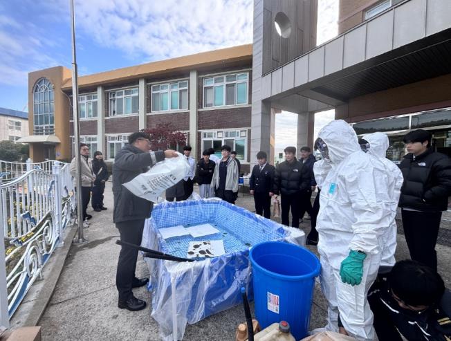 교육에는 해양오염 발생 원인과 실제 피해 사례 등 이론 교육과 더불어 방제 활동 시 사용하는 보호복 착용, 나노뜰채를 활용한 모의 방제 작업 등 체험 프로그램도 함께 진행됐다.
