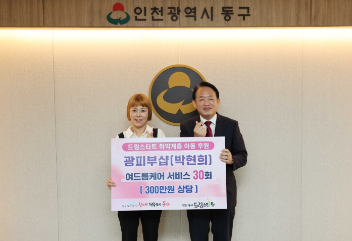 [뉴스앤톡] 인천 동구와‘광피부샵’(대표 박현희)은 지난 29일 구청 접견실에서 관내 드림스타트 아동을 위해 300만원 상당의 여드름 케어 서비스를 후원하는 기탁식 열었다고 밝혔다.