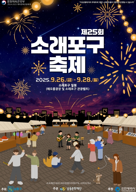 [뉴스앤톡] 인천시 남동구와 남동문화재단은 오는 9월 26~28일까지 사흘간 열리는 ‘제25회 소래포구 축제’의 먹거리 정보를 사전에 투명하게 공개한다고 22일 밝혔다.