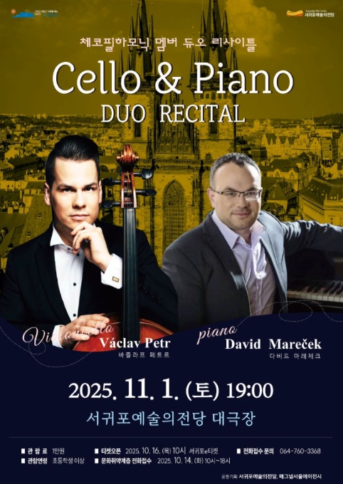[뉴스앤톡] 서귀포시는 11월 1일 오후 7시, 서귀포예술의전당 대극장에서 체코필하모닉오케스트라 멤버 '첼로 & 피아노 듀오 리사이틀'을 개최한다고 밝혔다.
