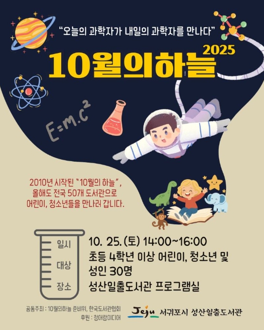 [뉴스앤톡] 서귀포시성산일출도서관은 오는 10월 25일 오후 2시부터 4시까지 과학자들의 재능기부로 진행되는 전국 과학 강연 행사 ‘10월의 하늘’을 운영한다.