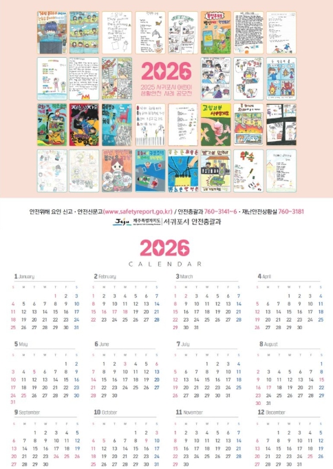[뉴스앤톡] 서귀포시는 지역사회에 생활 속 안전의식 확산을 위해 2025 어린이 생활안전사례 공모전 수상작 30작품을 활용한 안전문화달력 1,500부를 제작하여 전 부서와 학교, 유관기관에 배부했다고 밝혔다.