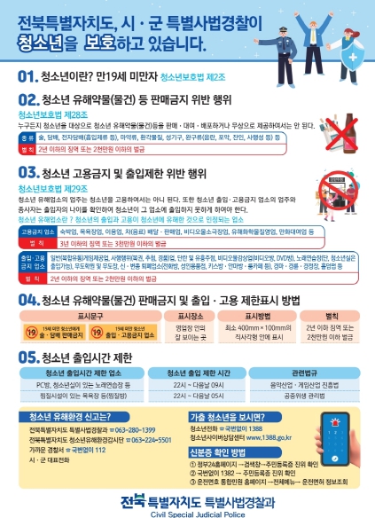 오택림 전북특별자치도 도민안전실장은 “청소년들이 안전하고 건강하게 성장할 수 있는 환경을 만드는 것이 무엇보다 중요하다”며 “업소에서도 신분증 확인 등 기본수칙을 철저히 준수해 청소년 보호에 적극 동참해 달라”고 당부했다.