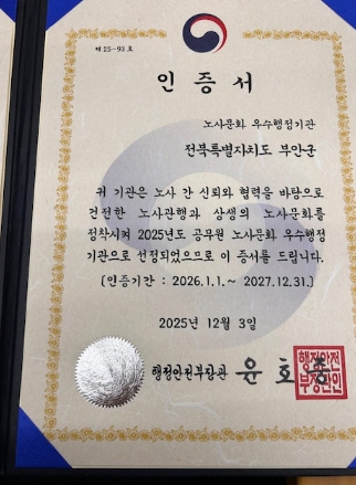 먼저 부안군 노사협력팀은 행정안전부 주관 2025년 공무원 노사문화 우수행정기관으로 선정돼 장관상 표창과 함께 2년간 우수행정기관으로 인증받는 성과를 달성했다.