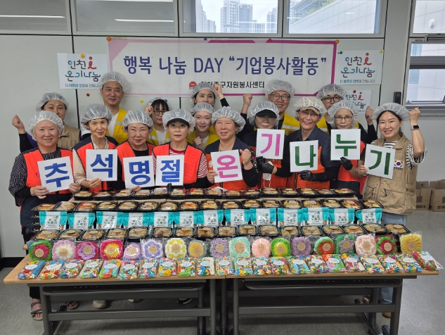 [뉴스앤톡] 인천중구자원봉사센터는 민족 최대 명절인 추석을 맞아 지난 24일 인천공항에너지㈜(대표이사 이경용) 임직원과 함께 ‘온기 나눔 캠페인’과 연계한 ‘추석 명절 음식 나눔 행사’를 진행했다고 밝혔다.