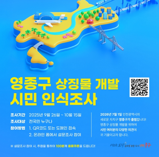 조사 내용으로는 ▲영종구를 대표하는 키워드 ▲영종구의 도시이미지 ▲영종구를 상징하는 캐릭터 소재가 포함돼 있다. 조사 결과는 상징물 개발의 방향성을 설정하는 데 중요한 기초자료로 활용될 예정이다.