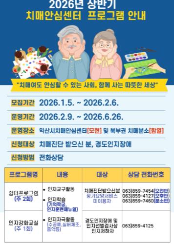 모집 대상은 익산시 치매안심센터에 등록된 경도인지장애 및 경증 치매환자 가운데 장기요양서비스를 이용하지 않는 시민이다.