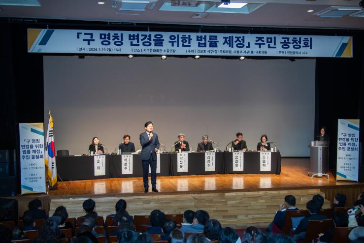[뉴스앤톡] 인천 서구는 지난 19일 서구문화회관 소공연장에서 지역주민 약 200여 명이 참석한 가운데 ‘구 명칭 변경을 위한 법률 제정 주민 공청회’를 개최하고 주민 의견을 수렴했다.