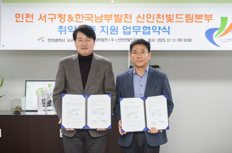 [뉴스앤톡] 인천 서구는 지난 11일 한국남부발전(주) 신인천빛드림본부(본부장 김경수)와 함께 취약계층 삶의 질 향상과 지역사회 복지 안전망 강화를 위한 업무협약(MOU)을 체결했다.