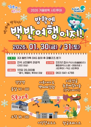 시 관계자는 "이번 겨울방학 시티투어는 가족 단위 관광 수요를 반영한 맞춤형 프로그램으로 기획된 만큼 특별한 추억을 선사할 것으로 기대한다"며 "앞으로도 계절과 대상별로 특화된 시티투어를 통해 익산 관광의 매력을 널리 알리겠다"고 말했다.
