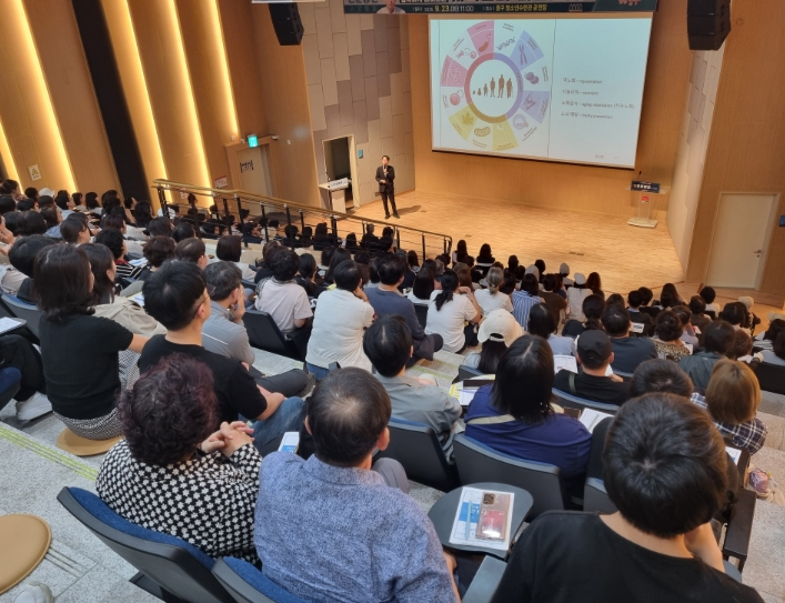이번 강연은 구민 200여 명의 열띤 호응 속에 ‘행복하게 나이 드는 저속노화 마인드셋’이란 주제로 진행됐다.