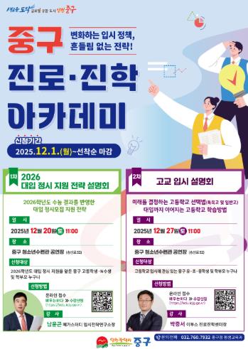 이번 설명회는 중구에서 추진하는 진로·진학 아카데미 중 하나로, 변화하는 입시 환경에 대응해 실질적인 정보 제공으로 학생과 학부모들의 불안감을 덜고 체계적으로 진학 계획을 수립할 수 있도록 지원하고자 마련됐다.