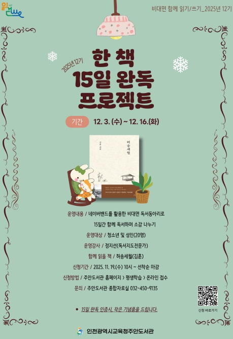 [뉴스앤톡] 인천광역시교육청주안도서관은 11월 19일 오전 10시부터 ‘12기 비대면 함께 읽기-한 책 15일 완독 프로젝트’ 참여자를 모집한다.