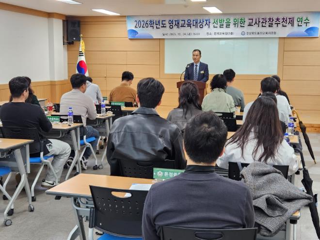 울진교육지원청은 재능 있는 영재교육대상자를 효과적으로 발굴하기 위해 지난 10월 24일 초·중학교 영재교육 업무 담당교사 및 희망 교사 20여 명을 대상으로 교사관찰추천제 연수를 실시했다.