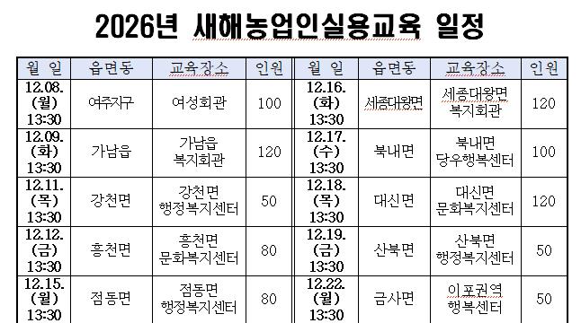 지난해에 이어 올해도 12월 조기 교육체계 추진으로 영농계획 수립에 만전을 기하고자 했으며, 교육은 읍·면·동별 벼농사교육 10회로 운영된다. 특히 이상기온 대응을 위한 폭염 현장사례 교육을 신규 도입해 기후 변화에 대응하는 실질적인 교육내용을 강화했다. 예상 교육인원은 900명이다.
